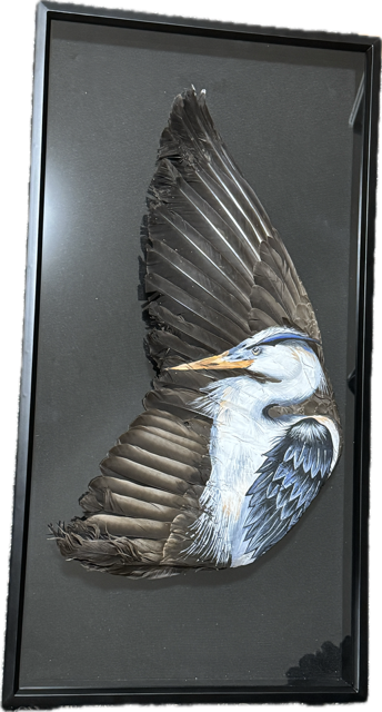 Jessica Somers utilizes the natural curve and texture of the preserved Goose wing to enhance the elegance of the Heron. The feathers of the wing mimic the reeds and ripples of the water, providing an organic backdrop that makes the painted subject feel alive. The cool blues and slate greys of the Heron contrast beautifully with the warm, earthy tones of the wing, resulting in a piece that feels both grounded and ethereal.