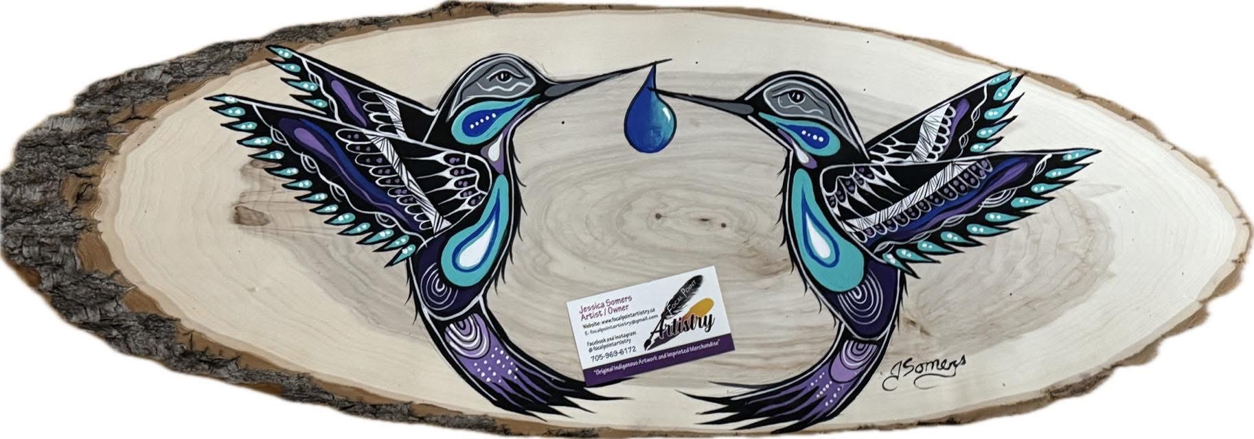 Bring the medicine of joy into your home with **Hummingbirds on Wood**. This original, hand-painted artwork by Jessica Somers captures the tireless energy and beauty of the Hummingbird on a unique slice of kiln-dried balsam poplar.