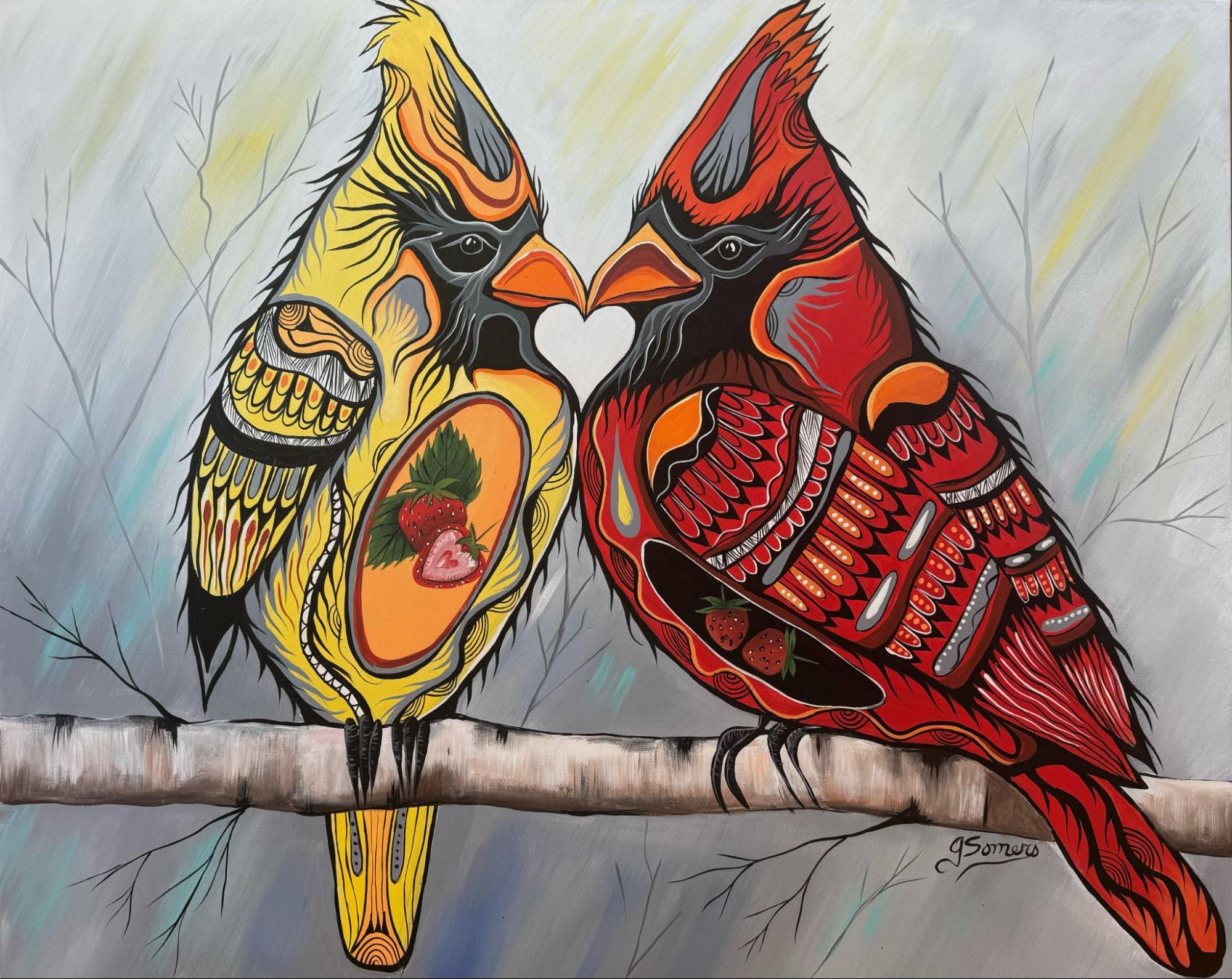 Love Birds is a stunning 16×20″ Woodland-style art print by Jessica Somers. Depicting two cardinals united in a heart-shaped embrace, this larger format piece is a vibrant celebration of devotion, vitality, and the sacred beauty of lifelong partnership.