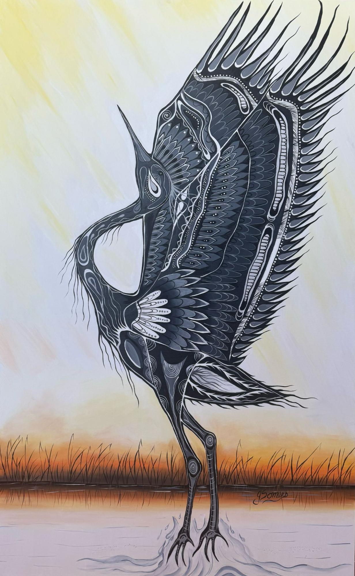 Greet the day with the elegance of Morning Dance. This striking 8×16″ archival fine art print captures the silhouette of a Crane dancing beneath a vibrant orange morning sky. A powerful symbol of leadership, grace, and the promise of renewal, this piece adds warmth and inspiring Indigenous storytelling to your home.