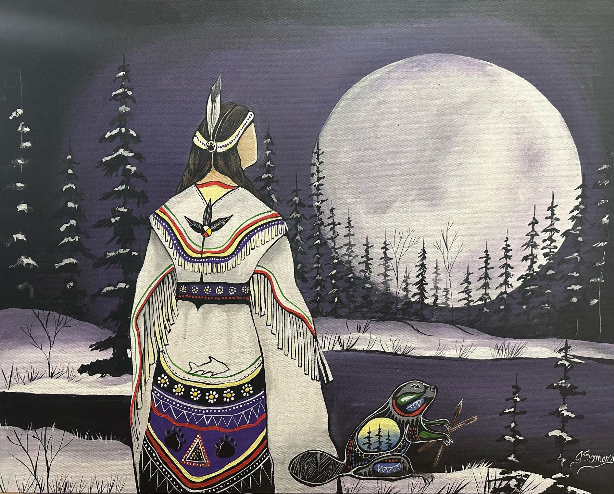 In the larger 16×20″ format, November Moon becomes a window into the sacred stillness of the land. November represents the preparation for the deep sleep of winter—a time when the earth settles and breathes. This artwork is a teaching on the necessity of surrender. It depicts a woman in quiet communion with the moon, reminding us that we, too, are part of nature’s cycles. We are allowed to rest. We are allowed to let go. This piece is a visual permission slip to pause and honor your own need for renewal.