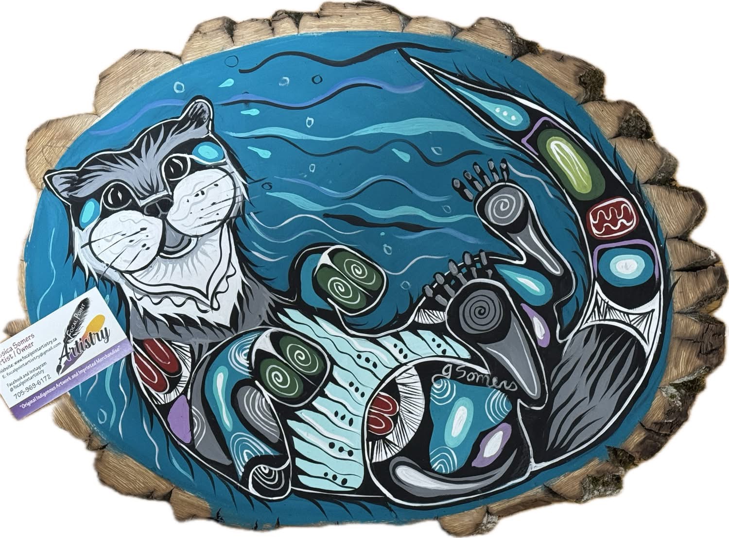 Invite joy and curiosity into your space with **Otter Swimming on Wood**. This original hand-painted artwork by Jessica Somers captures the playful spirit of the Otter (Nigig) on a rustic slice of kiln-dried balsam poplar.