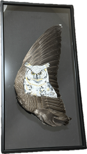 In the quiet of the night, the Owl (Kokoko) sees what others cannot. Owl Framed Goose Wing embodies the medicines of deep intuition and clarity. The Owl teaches us to trust our inner knowing and to navigate the shadows with confidence. Painted upon the wing of a Goose—a symbol of community and navigation—this piece invites you to trust your own journey. It serves as a guardian of the “unseen,” reminding us that true wisdom often comes from silent reflection and connecting to the mysteries of the spirit world.