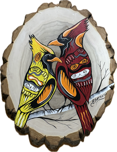 Invite a message of love and connection into your home with **Two Cardinals on Wood**. Hand-painted by Jessica Somers on kiln-dried balsam poplar, this original piece honors the spirit of the Winged Ones.