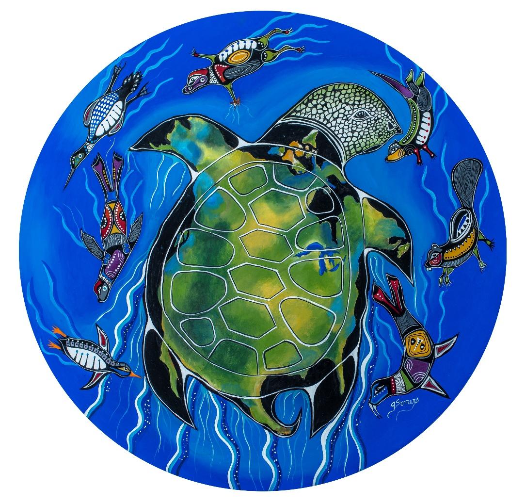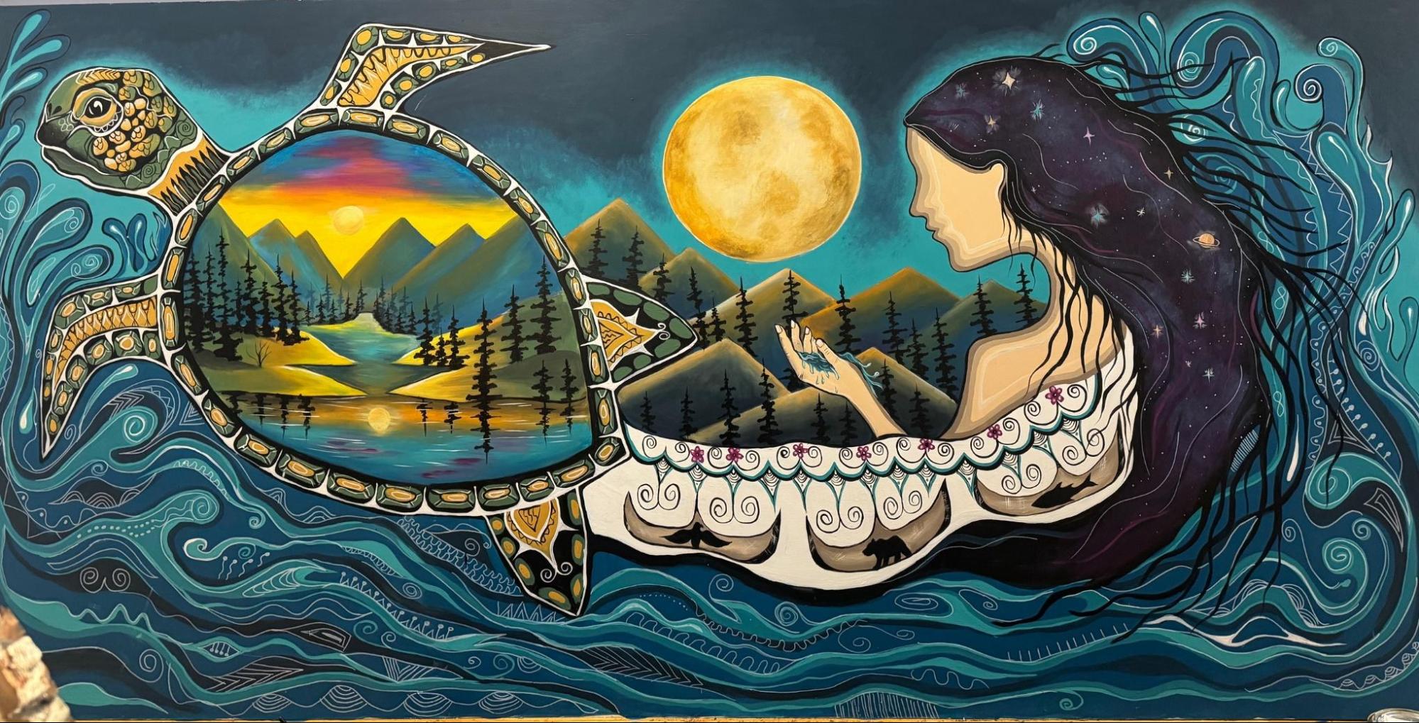 Participants paint a canoe on wood, guided by the teaching that Turtle Island represents our shared home, and that moving forward requires everyone to paddle together.
